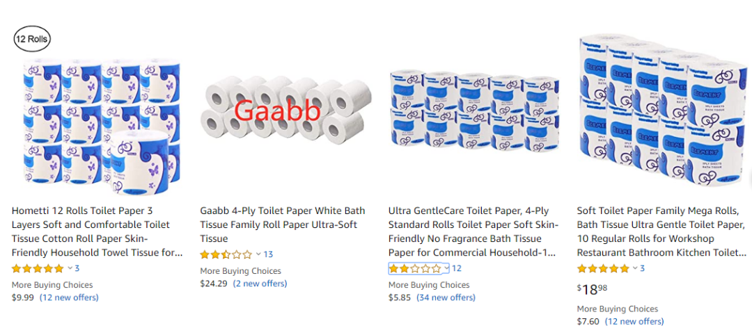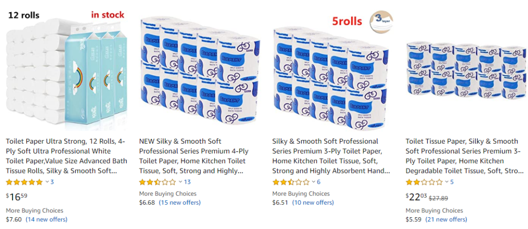 在美国站,目前厕纸活跃商品有3243条,而且大部分都是新listing,很多卖家都是看到市场供不应求状况以及因为类目受限不得不做起了厕纸这个品类。当然也就免不了被人跟卖,搜索toilet paper 一词结果出来前三页几乎难逃其手。