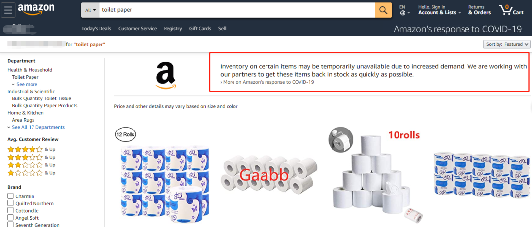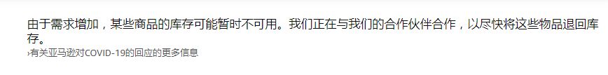 由于疫情持续蔓延,亚马逊Prime服务遭遇延误,许多常用家居用品的库存告罄。亚马逊在博客中表示,“由于人们在线购物的比率急剧上升,导致交货期比平常更长。” 同时,亚马逊在网站顶部也发布了告示,“由于需求增加,某些商品的库存暂时不可用。”