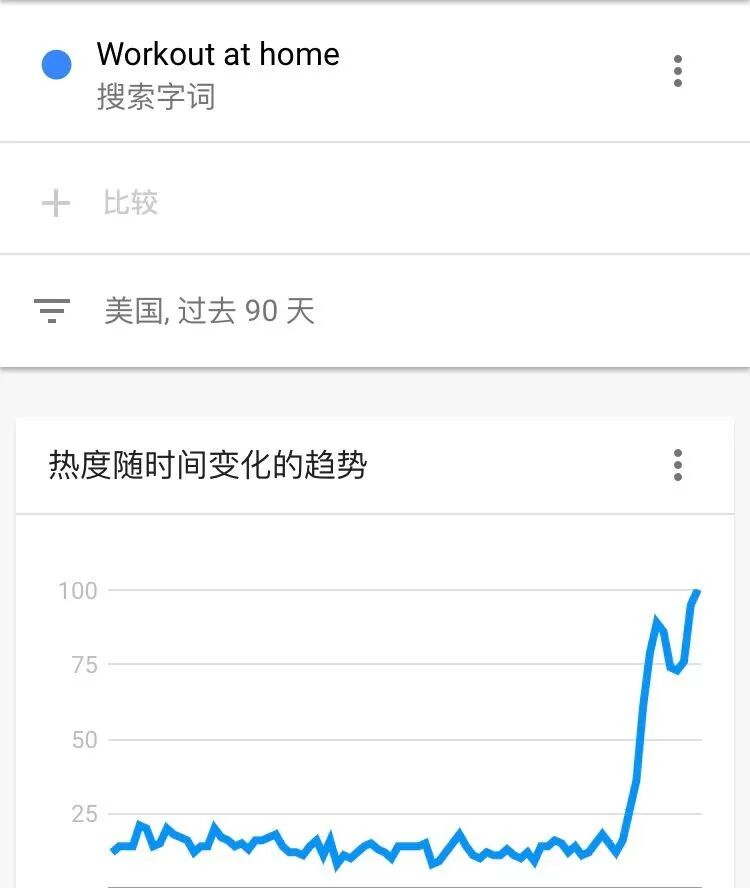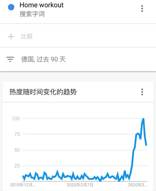 打开Google Trends,美国和德国居家运动的搜索量几乎如出一辙,在过去一个月之内直线上升。