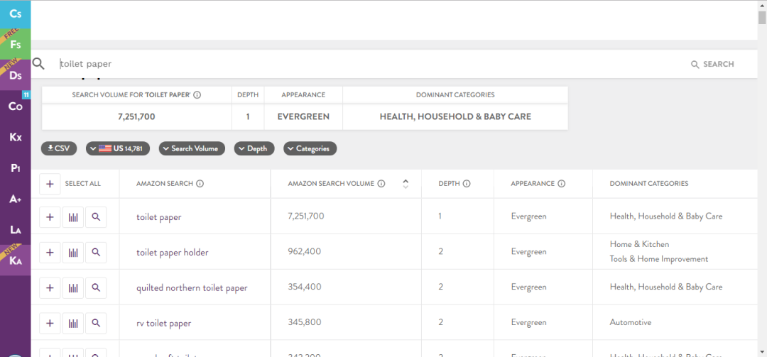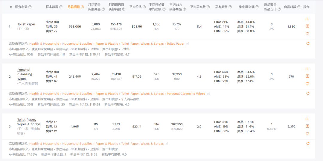3月17日亚马逊美国站欧洲站发布了FBA暂停接收非医疗和生活必需品的消息,几乎所有卖家都是一片惨淡,而厕纸却高居榜首,拥有两百多万的搜索量。政策一出,亚马逊美国站搜索量排列前茅的,确实也都是生活类的日常必需品。