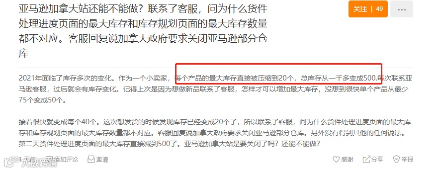 有卖家在卖家交流群中反映,加拿大站最近库存限制收的很紧,原本上个月新品可以发75个,这个月变成20个了。