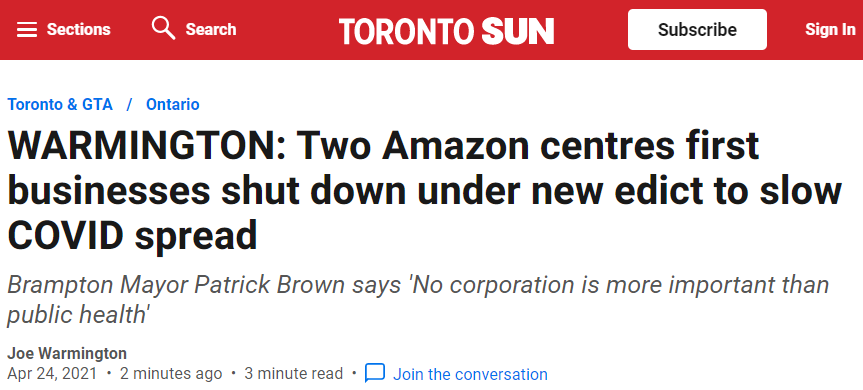 据CBC消息,多伦多皮尔区卫生局上周六宣布,已经关闭两家位于皮尔区的亚马逊物流中心,以控制爆发的新冠疫情。