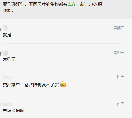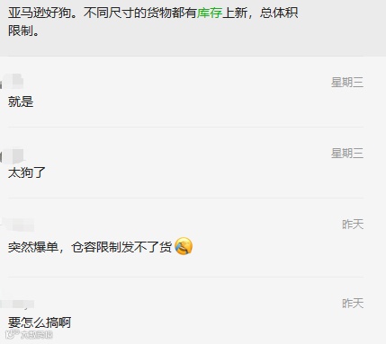 而库容的骤降只会影响卖家出单的速度,有卖家吐槽,突然爆单后,却因为限制库容发不了货。