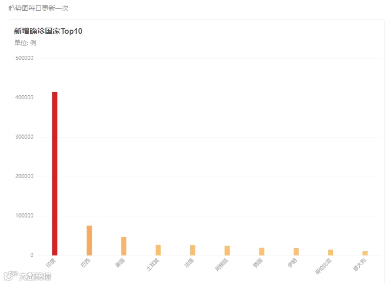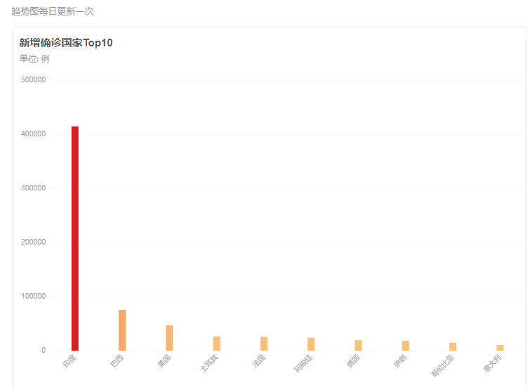 根据印度卫生部公布的最新数据,截至当地时间5月6日8时,过去24小时内,印度新增新冠肺炎确诊病例412262例,再创印度疫情暴发以来单日新增病例数新高,也再次刷新全球单日单个国家新增确诊病例最高纪录。