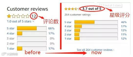 或许亚马逊看到了这一点,在新版的review中,着重显示评级,而淡化评论数量。这样一来,对于新产品上线是一种鼓励。新产品上架后,只要良性运营,即便评论数量不多,但依然可有较好的星级,并受到顾客的青睐,也能快速获得不同国家用户的好评。