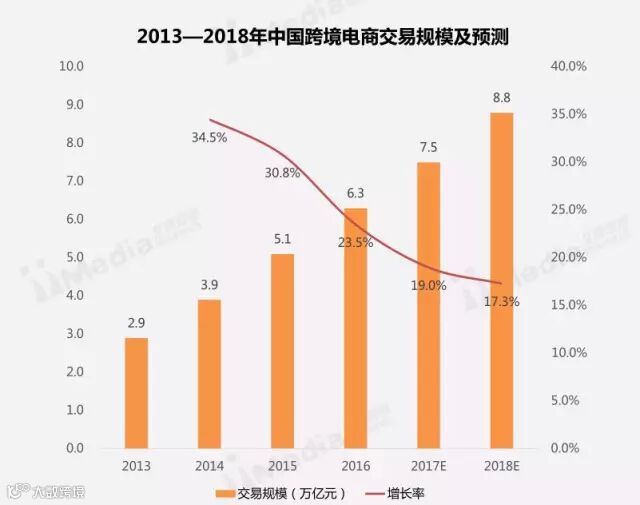iiMedia Research(艾媒咨询)数据显示,2016年跨境电商整体交易规模(含零售及B2B)高达6.3万亿元人民币,较2015年增长23.5%。预计2017年跨境电商交易规模仍以较高增速发展,有望增至7.5万亿元。
