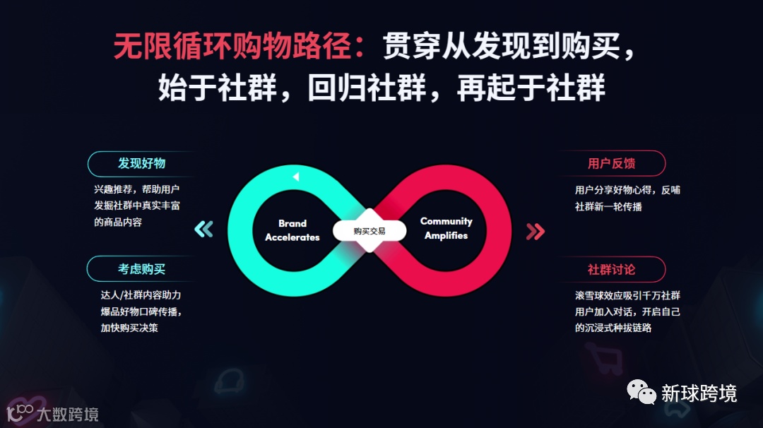 消费者根植社群,品牌同时也在社群中生长,通过TikTok社群电商新模式,用户在使用TikTok过程中不断触达,购买产品后会在社群中分享,与品牌互动等,无限循环消费者的全链路购物体验,最大化社群的购买力。