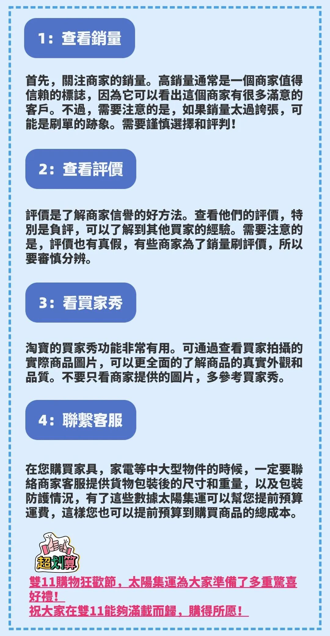 导读:太陽集運教你如何挑選信賴商家,讓您雙十一購物少走彎路!寄台灣多重福利即將開跑,低至3元!這個雙十一 更多超值 盡在太陽集運