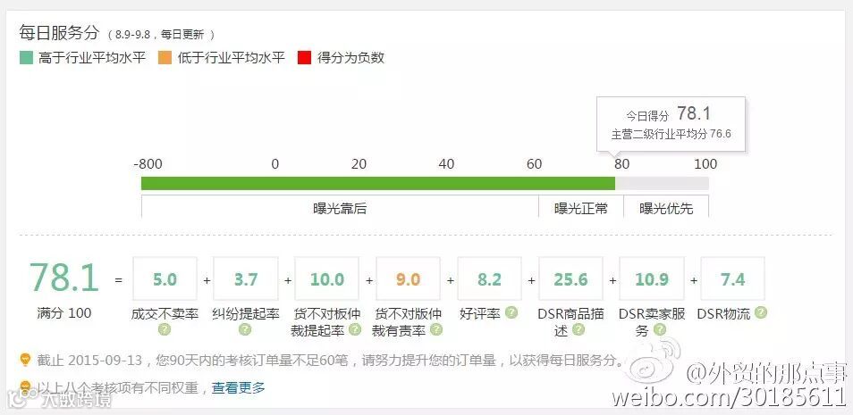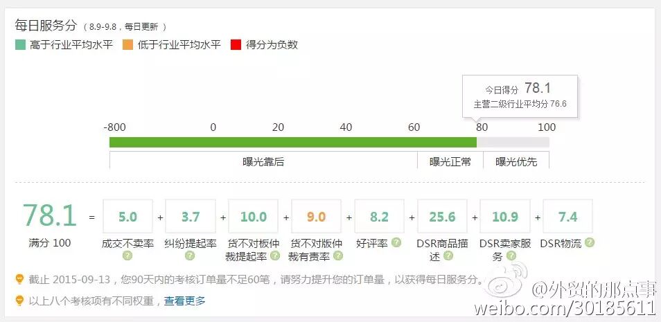 点评:为什么店铺会被无故关闭,也许从这些数据,卖家朋友就可以很清楚每天的帐号表现如何,具体到各个指标的得分,关注帐号的运营情况如何就看这些了!
