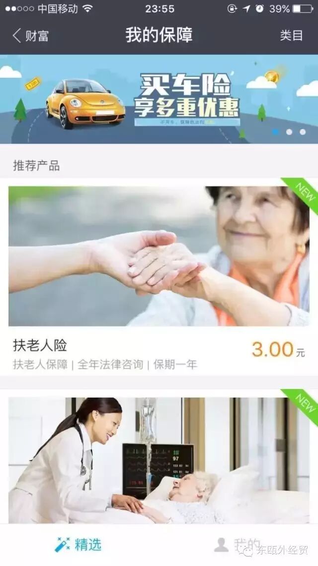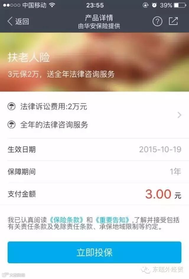 近日,支付宝在"我的保障"中新增了若干险种,其中包括一项"扶老人险",用户支付3元,一年期间最高可获得2万元的法律诉讼费用,并提供全年的法律咨询服务。