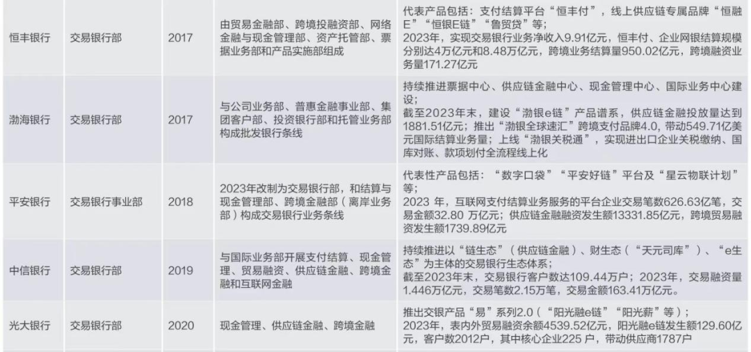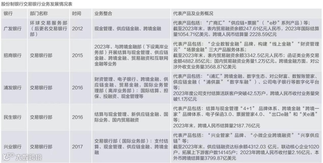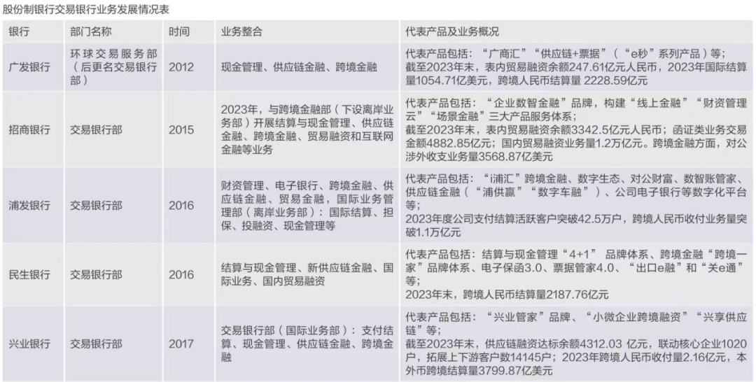 参考资料:《中国外汇》2024年7月1日 曾刚、唐蜜《股份制银行交易银行业务探求差异化发展》