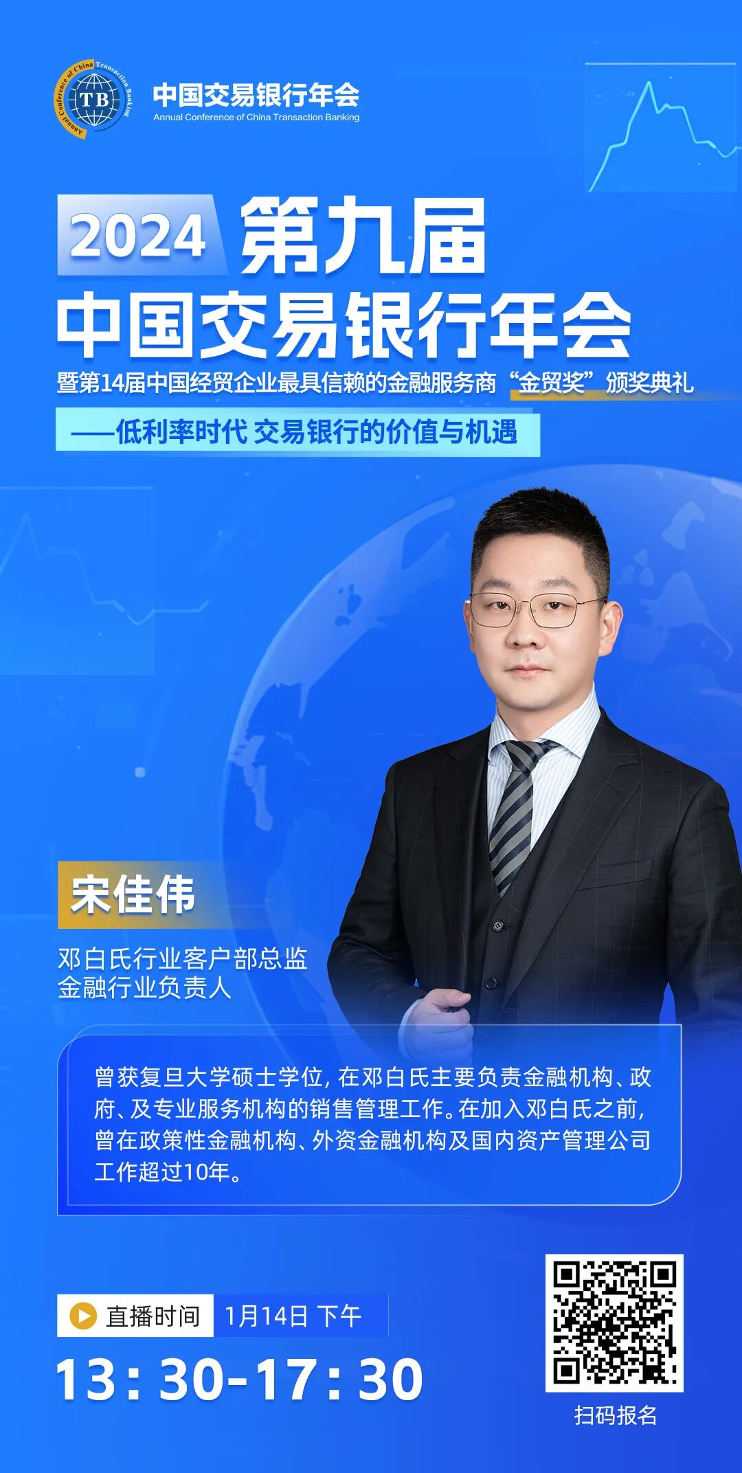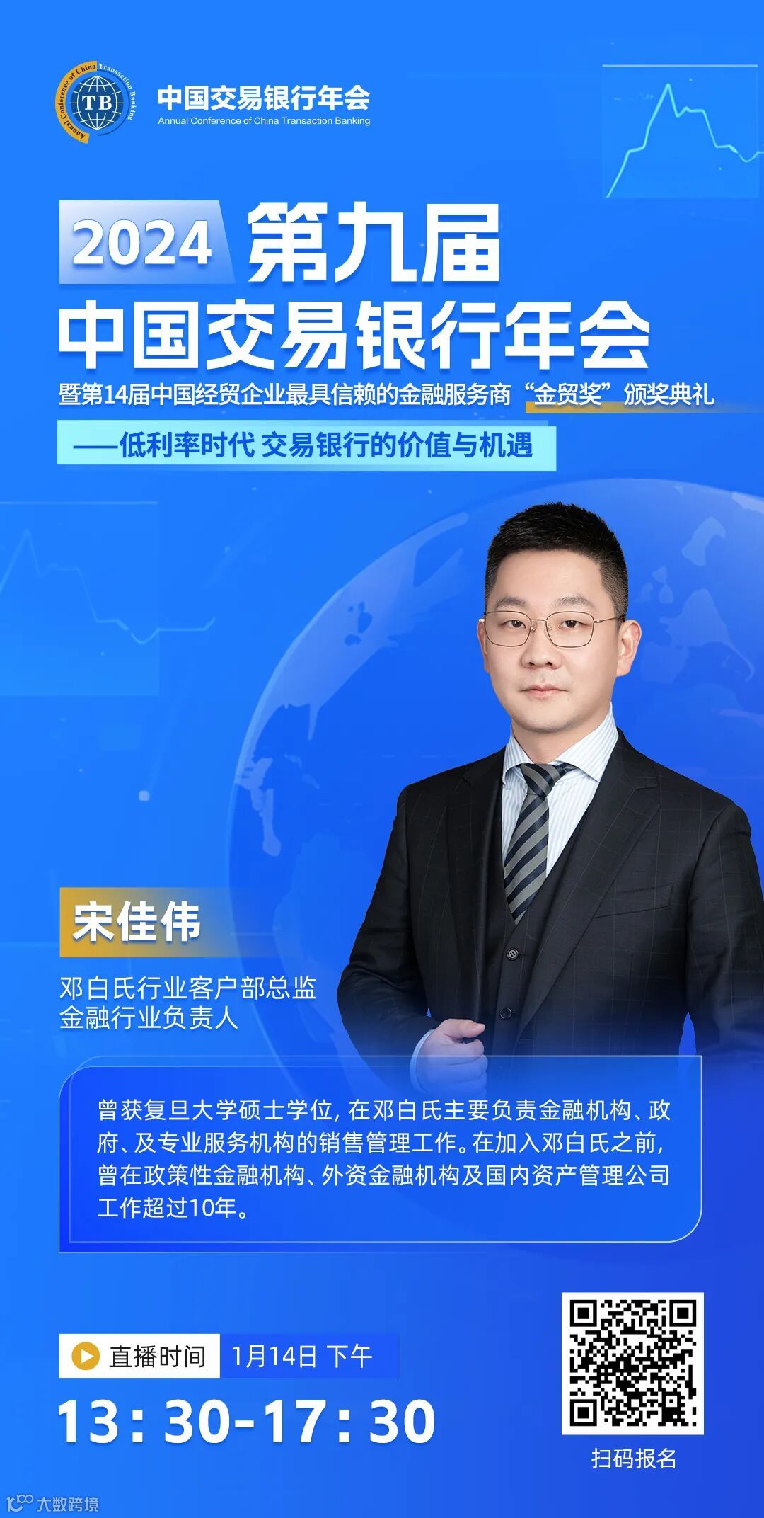在本次年会上,宋佳伟先生将以其丰富的行业经验与深刻的市场洞察,为与会者带来一场关于金融行业发展趋势与机遇的精彩演讲。他将分享自己对于交易银行在金融科技创新背景下的应对策略与未来发展路径的思考,为行业同仁提供宝贵的启示与借鉴。