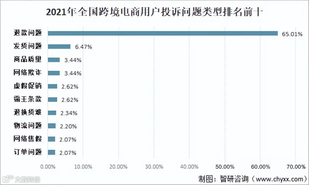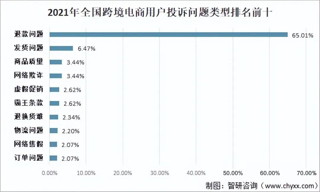 2021年全国跨境电商用户投诉问题类型排名前十的依次为退款问题65.01%、发货问题6.47%、商品质量3.44%、网络欺诈3.44%、虚假促销2.62%、霸王条款2.62%、退换货难2.34%、物流问题2.20%、网络售假2.07%、订单问题2.07%。