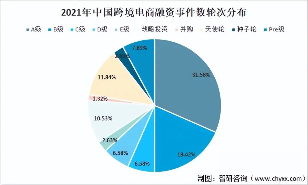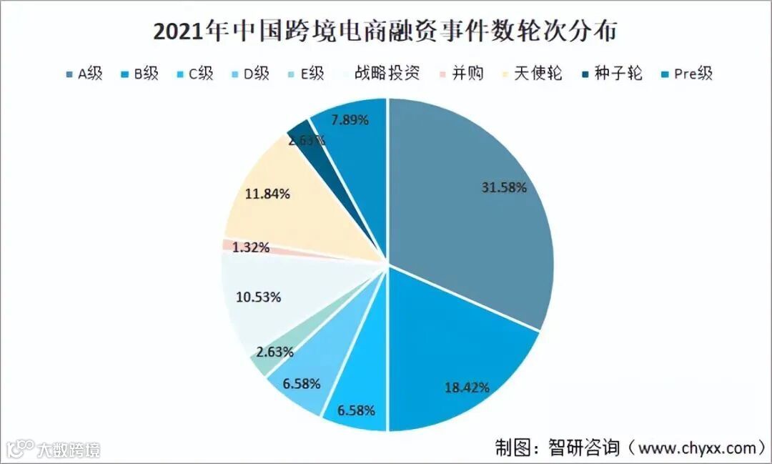 在融资轮次上,2021年中国跨境电商共发生77起融资。其中,天使轮9起,占比11.84%;Pre轮6起,占比7.89%;A轮24起,占比31.58%;B轮14起,占比18.42%;C轮5起,占比6.58%;D轮5起,占比6.58%;E轮2起,占比2.63%;战略投资8起,占比10.53%;并购1起,占比1.32%;种子轮2起,占比2.63%。