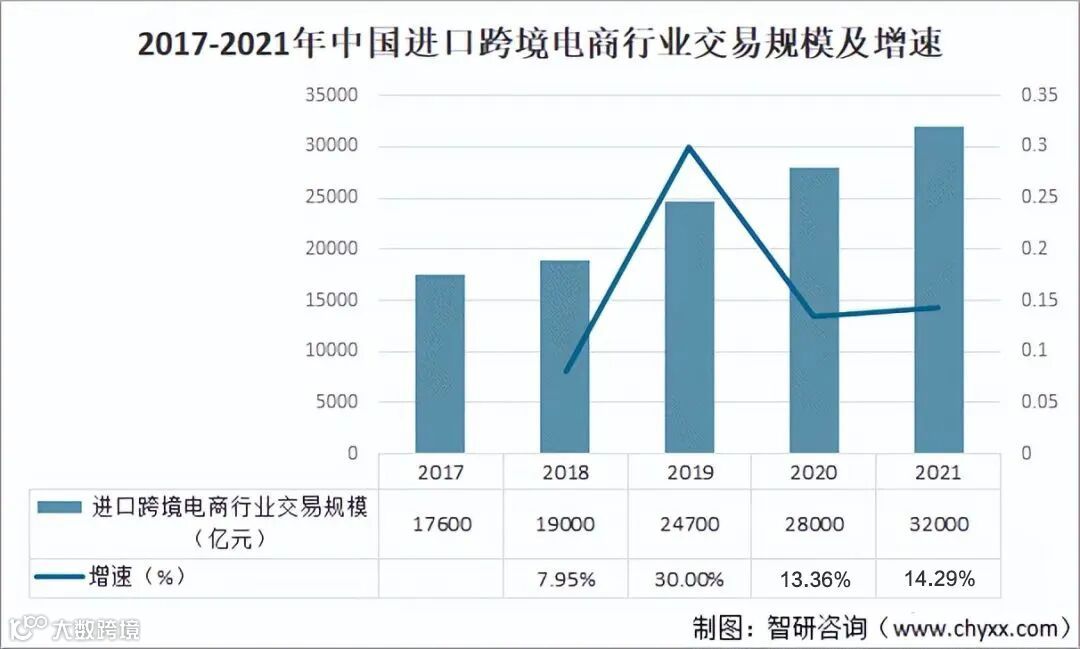 2021年,中国进口跨境电商行业交易规模32000亿元,较上年增加4000亿元,同比增长14.29%。