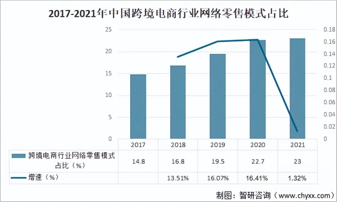 2017-2021年中国跨境电商行业网络零售模式占比及增速