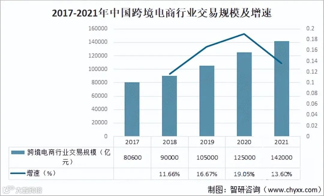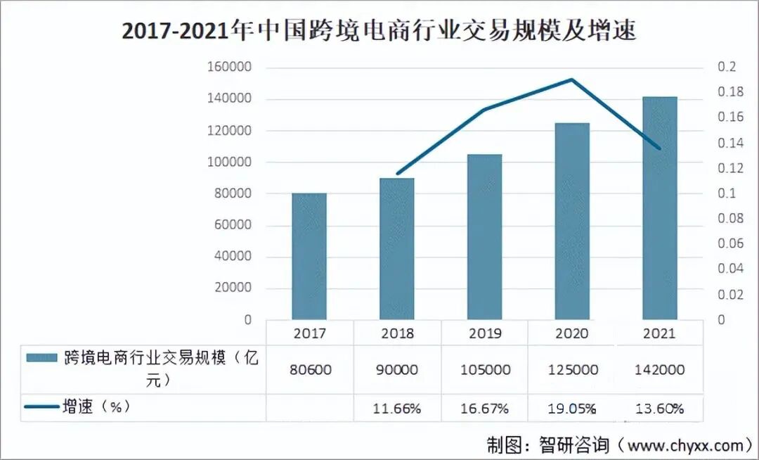 2020年,中国跨境电商行业交易规模125000亿元,较上年增加20000亿元,同比增长19.05%;2021年,中国跨境电商行业交易规模142000亿元,较上年增加17000亿元,同比增长13.6%。