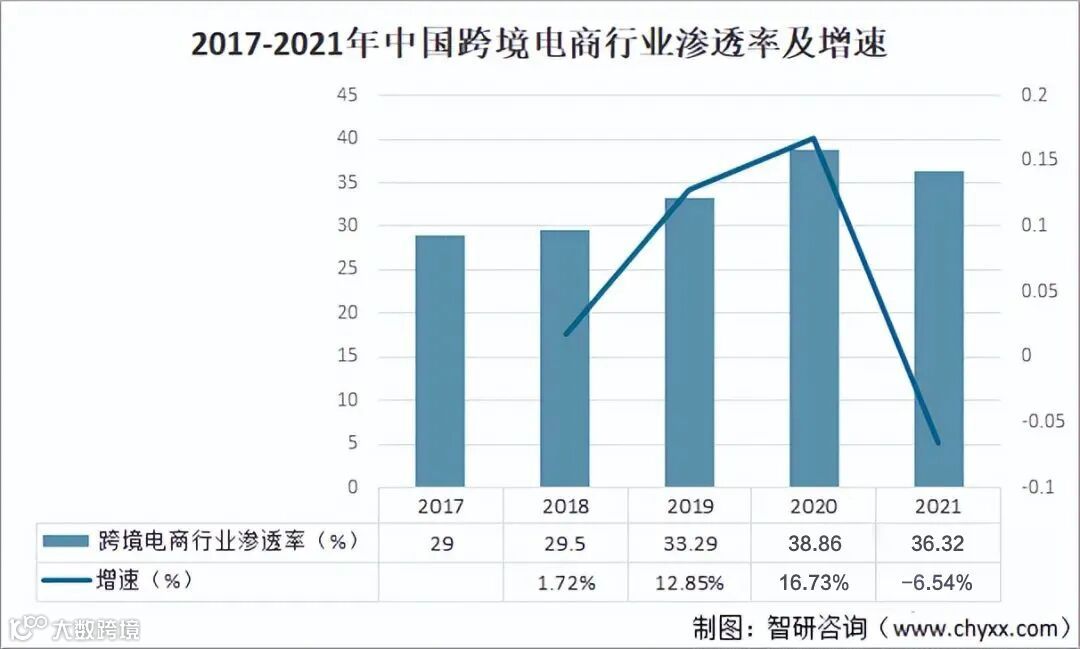 因部分跨境电商企业经营受损,以及中国货物贸易进出口增长的背景下,2021年跨境电商行业渗透率占比依然超过35%。