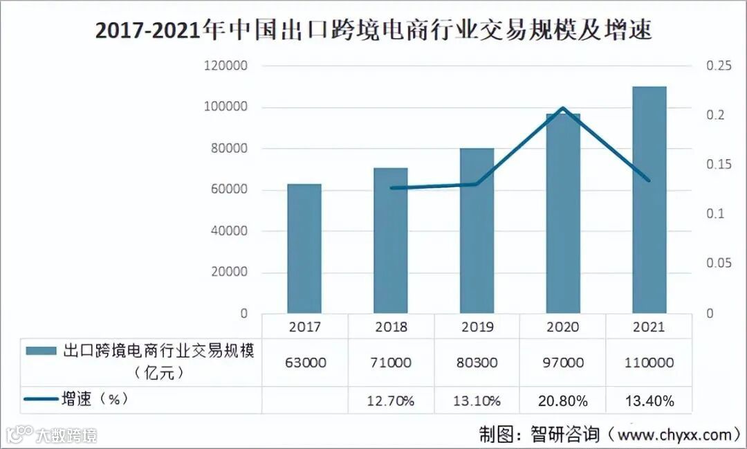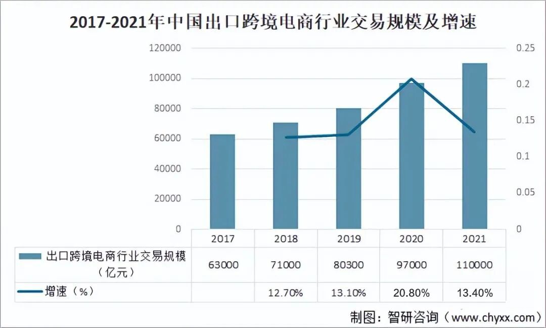 2021年,中国出口跨境电商行业交易规模110000亿元,较上年增加13000亿元,同比增长13.4%。