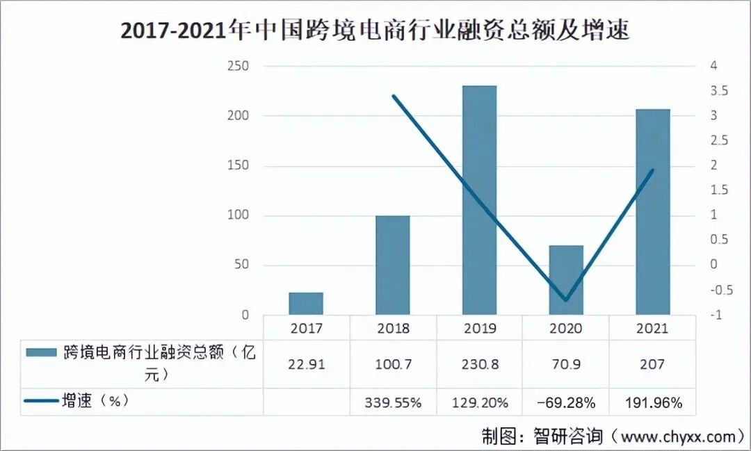 2021年,中国跨境电商行业融资总额207亿元,较上年增加136.1亿元,同比增长191.96%。