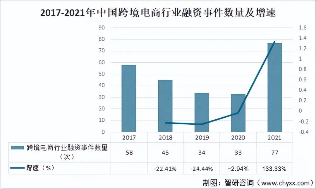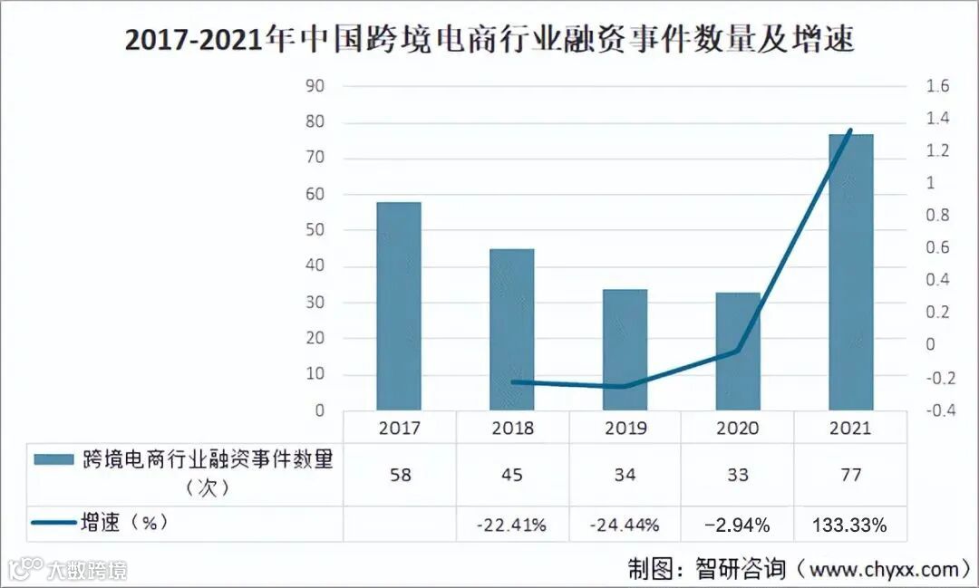 2021年,中国跨境电商行业融资事件数量77起,较上年增加44起,同比增长133.33%。