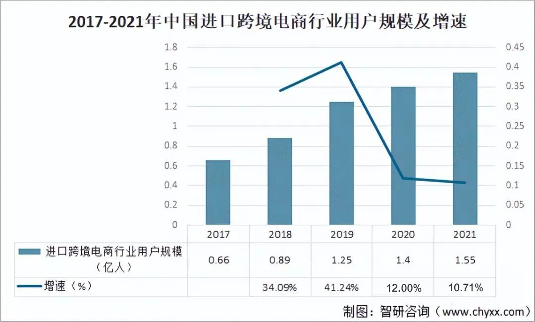 2021年,中国进口跨境电商行业用户规模1.55亿人,较上年增加0.15亿人,同比增长10.71%。