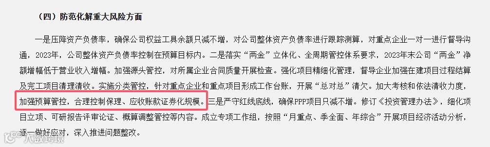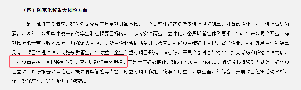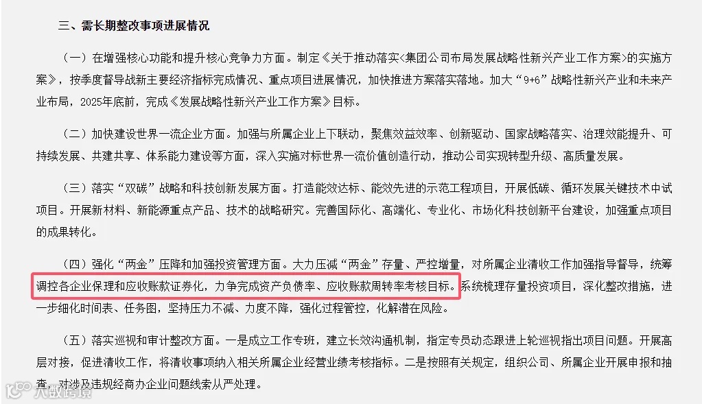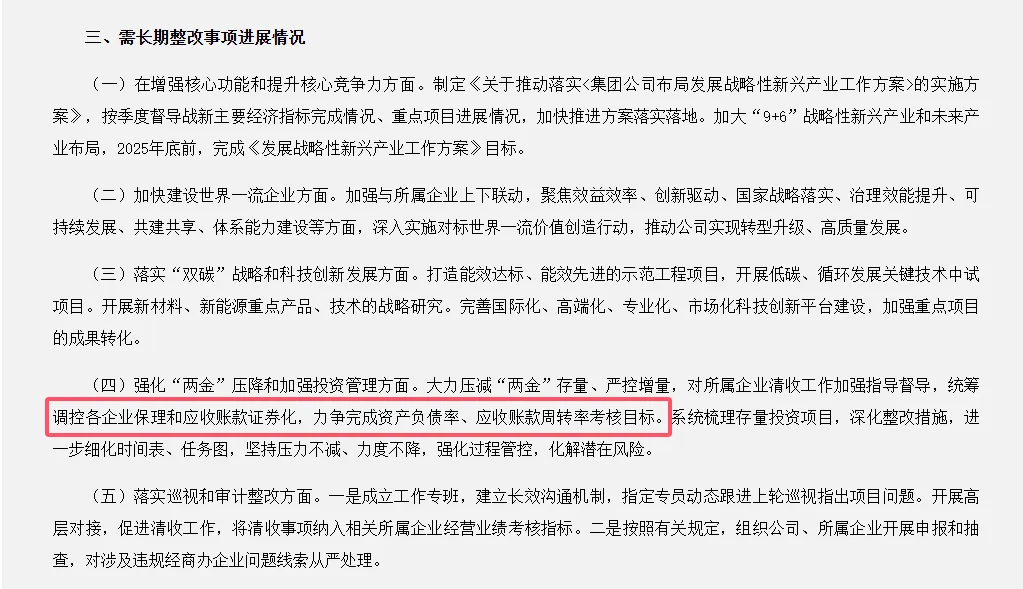 同时,中国化学工程提到:大力压减“两金”存量、严控增量,对所属企业清收工作加强指导督导,统筹调控各企业保理和应收账款证券化,力争完成资产负债率、应收账款周转率考核目标