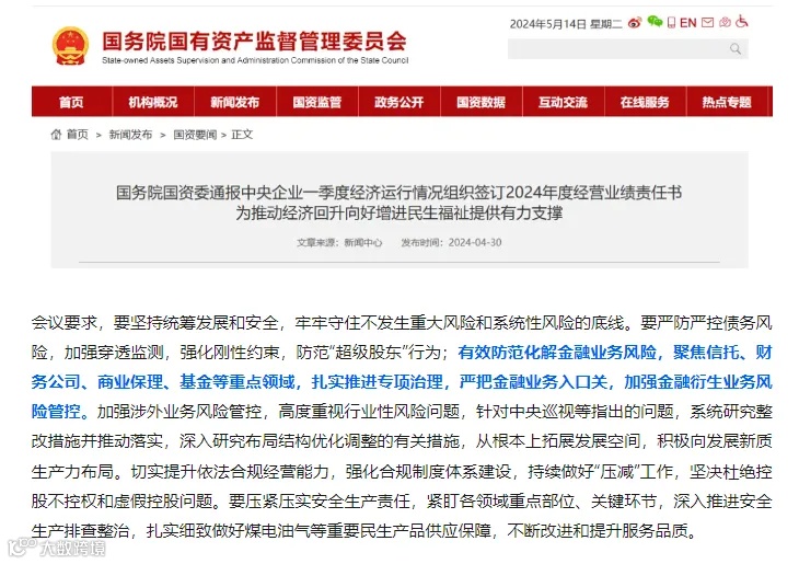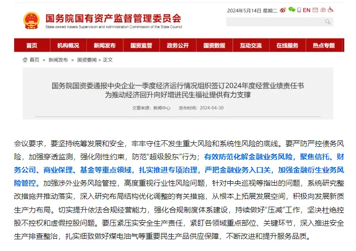 4月28日,国务院国资委召开视频会议,通报中央企业一季度经济运行情况,组织签订2024年度经营业绩责任书,其中,对商业保理公司提出“加强金融衍生业务风险管控”等要求。