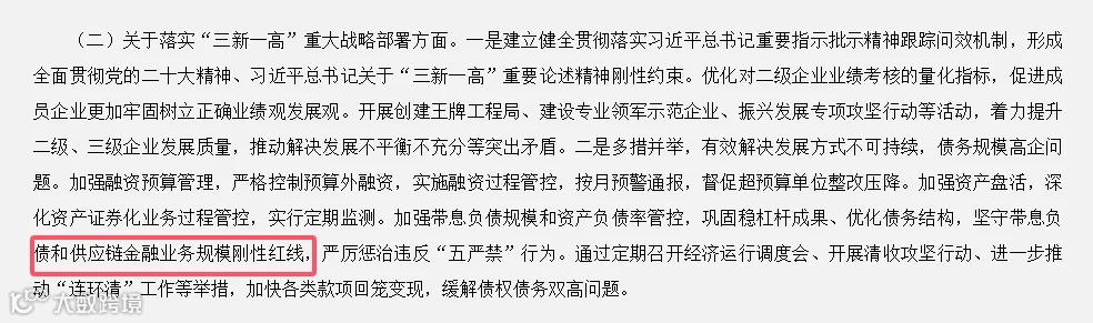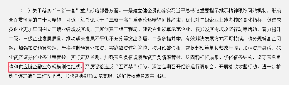 就在不久前,中国中铁也表示:加强带息负债规模和资产负债率管控,巩固稳杠杆成果、优化债务结构,坚守带息负债和供应链金融业务规模刚性红线,严厉惩治违反“五严禁”行为。