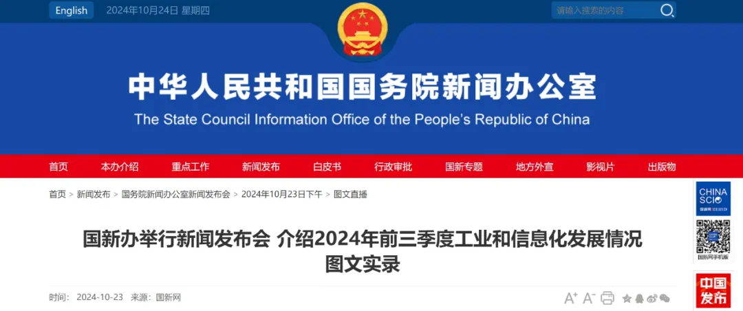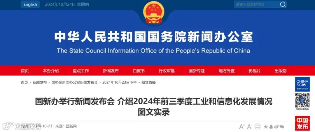 国务院新闻办公室10月23日下午举行新闻发布会,介绍2024年前三季度工业和信息化发展情况。