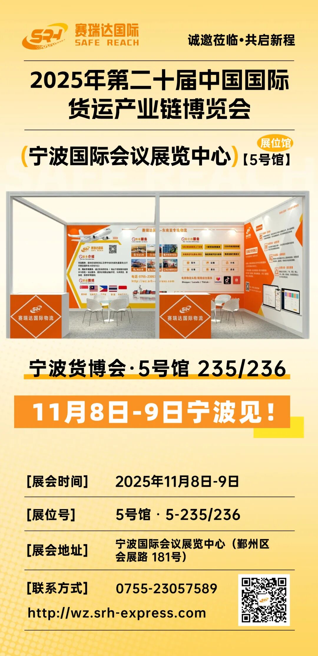 11 月 8 日 - 9 日,备受瞩目的中国国际货运产业链博览会将在宁波盛大启幕!赛瑞达国际物流作为深耕东南亚跨境物流领域的实力企业,将携全链路物流解决方案重磅亮相,诚邀各位合作伙伴、行业同仁莅临交流,共话物流新未来,共启合作新征程!