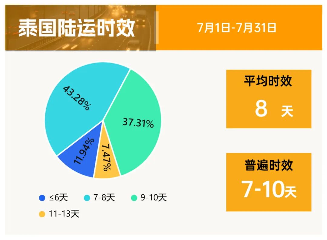 泰国陆运7月的整体时效在7-10天,平均时效8天。