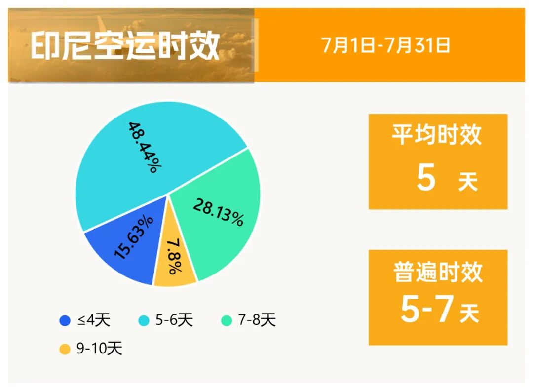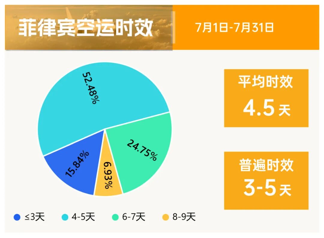 从7月的时效来看,菲律宾空运时效稳定,普遍时效在3-5天,平均时效4天,菲律宾因为其区域性,时效上有所差距。