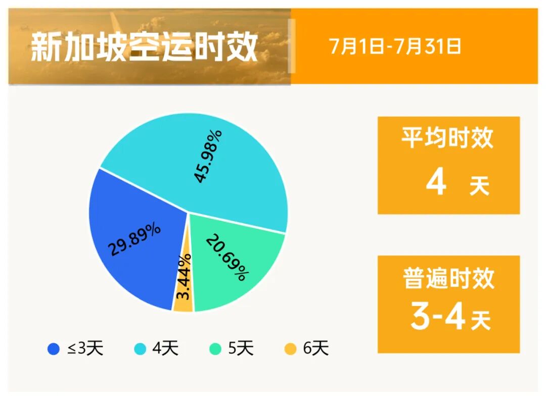 从7月的时效来看,新加坡的空运时效展现出了相对较为稳定的态势,空运时效在3-4天,平均时效在4天左右,时效整体变化不大。