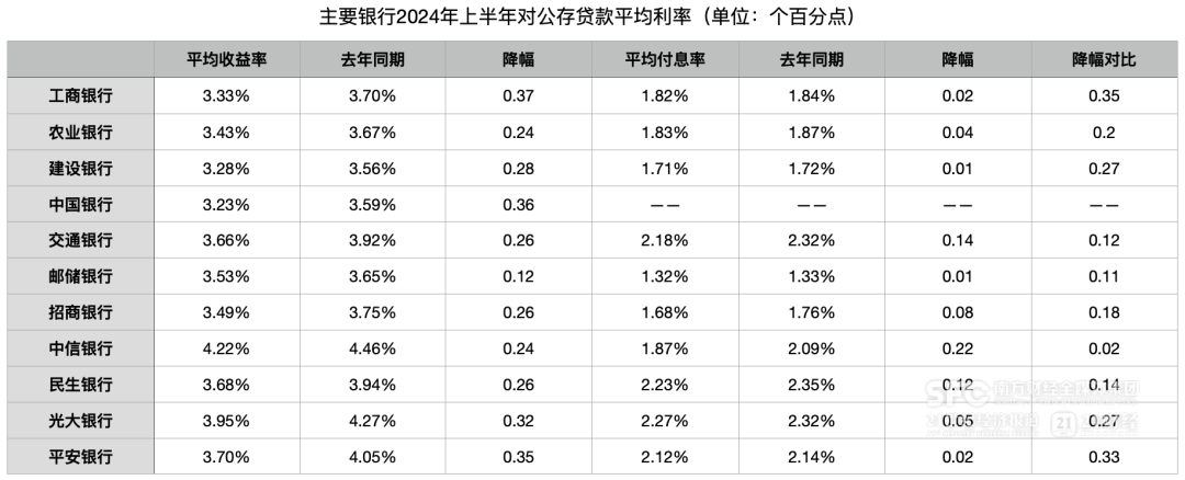 分析来看,对公业务中的利息净收入减少与对公贷款平均收益率下降有关,数据显示,上半年上述11家银行均有不同程度的下降,其中工商银行、中国银行、平安银行、光大银行降幅相对较大,超过0.3个百分点。