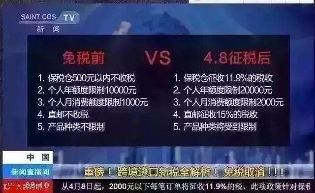 进口跨境电商不再适用行邮税,改为征收关税+增值税/消费税。(只有征收15%的税收,和产品种类将受到限制)