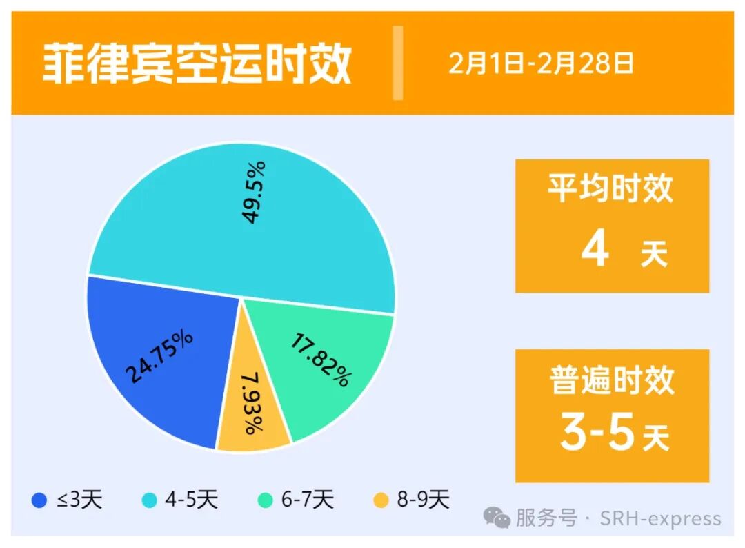 从2月的时效来看,菲律宾空运时效稳定,普遍时效在3-5天,平均时效4天,菲律宾因为其区域性,时效上有所差距。