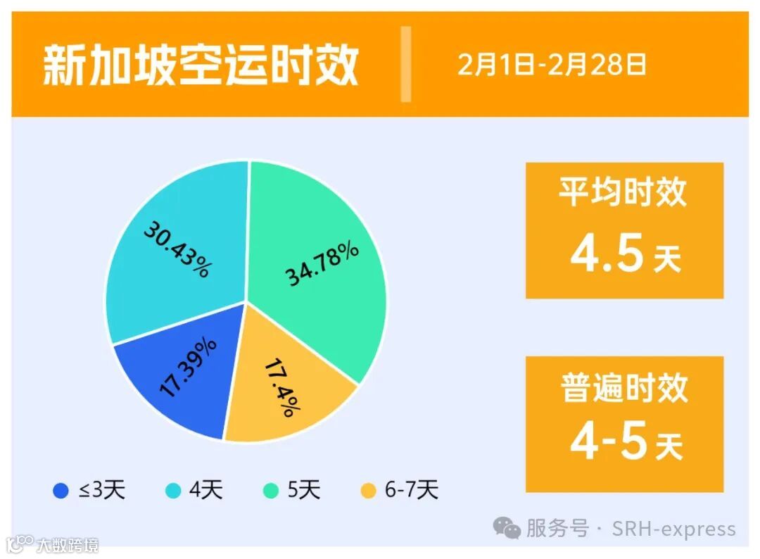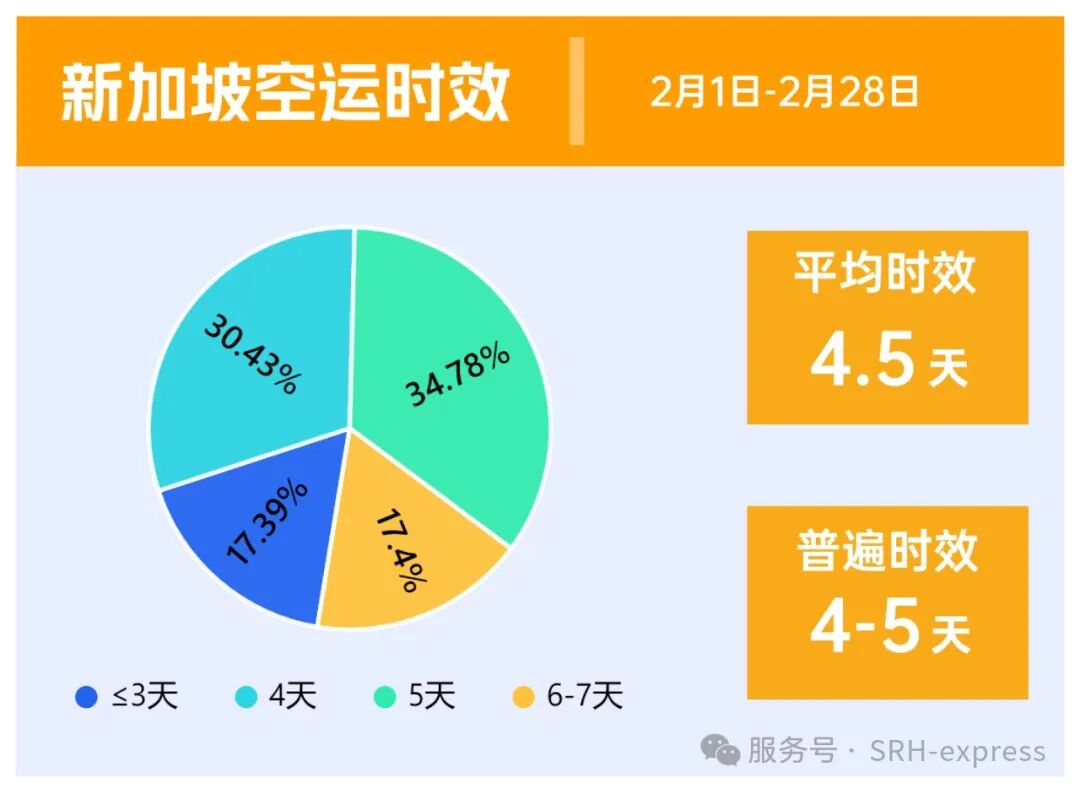 从2月的时效来看,新加坡的空运时效展现出了相对较为稳定的态势,空运时效在4-5天,平均时效在4天半左右,时效整体变化不大。