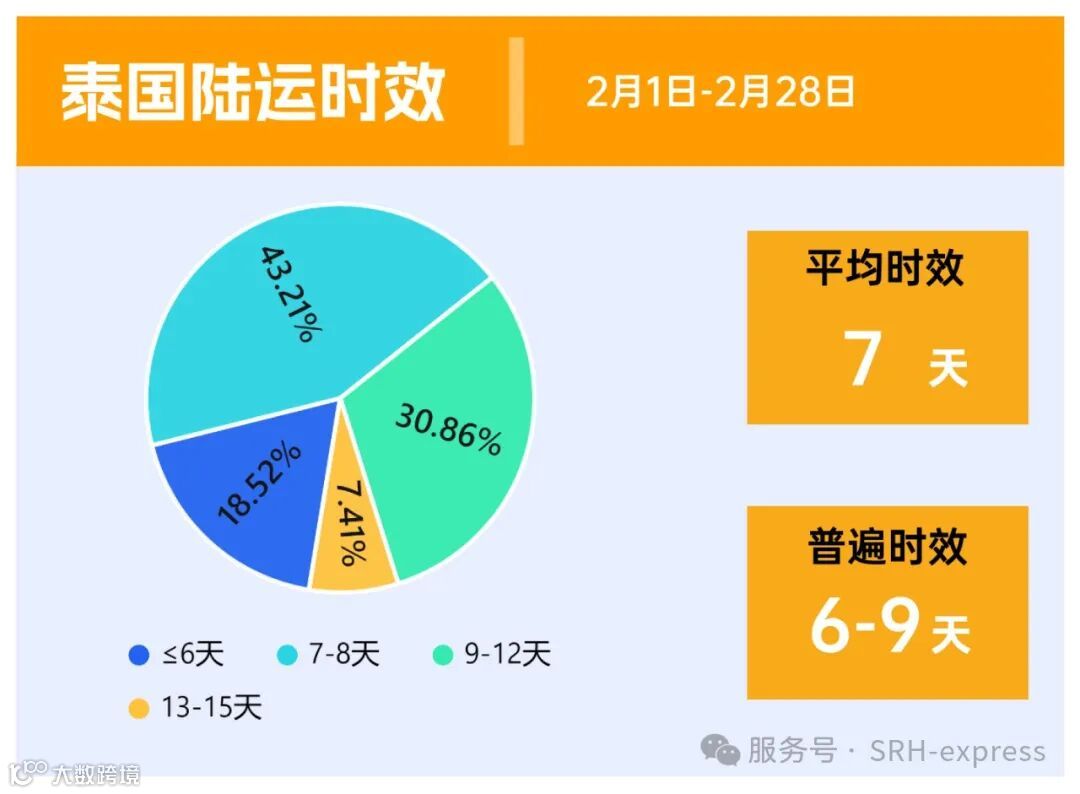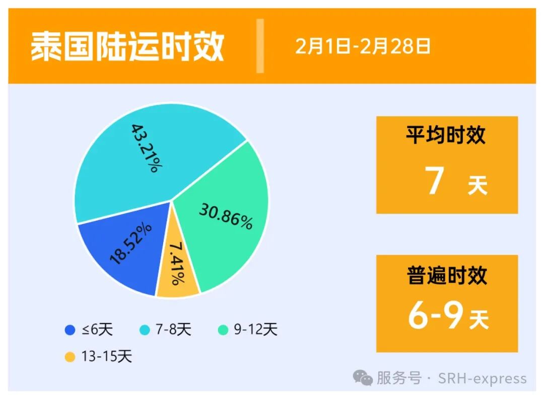 泰国陆运2月的整体时效在6-9天,平均时效7天,时效相对比较稳定。