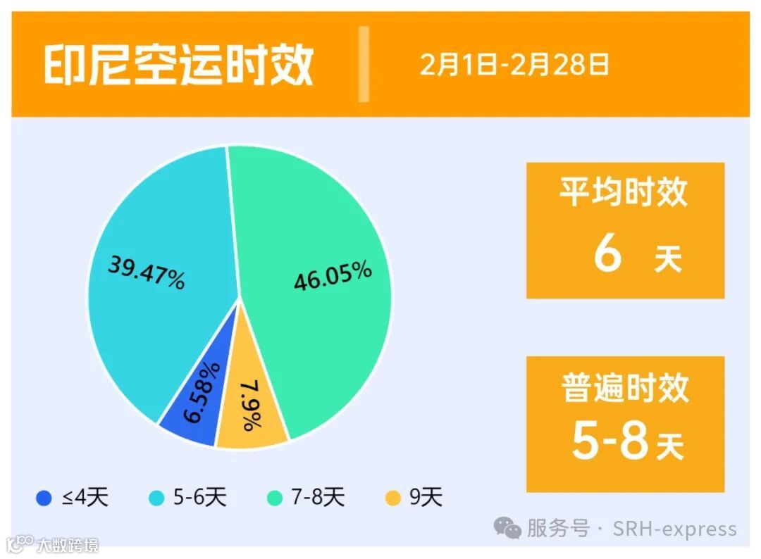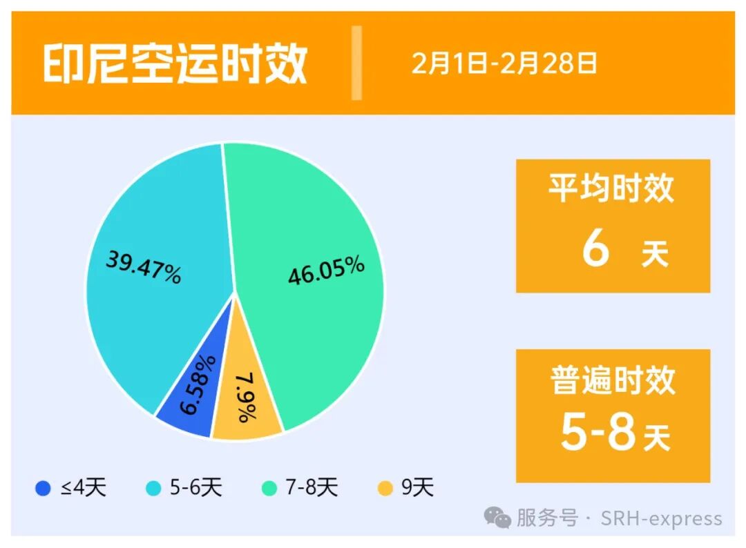 印尼因为红灯期,受清关影响,时效有所延长,空运2月普遍时效在5-8天,平均时效6天左右。