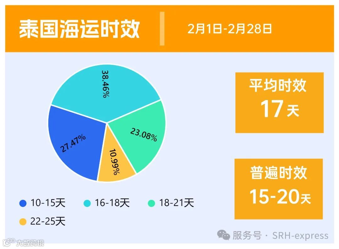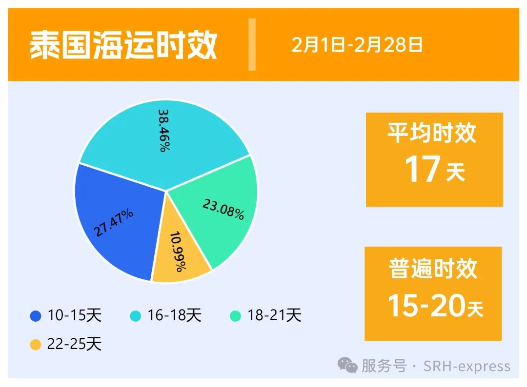 从2月的时效来看,泰国海运时效普遍在15-20天,平均时效17天。