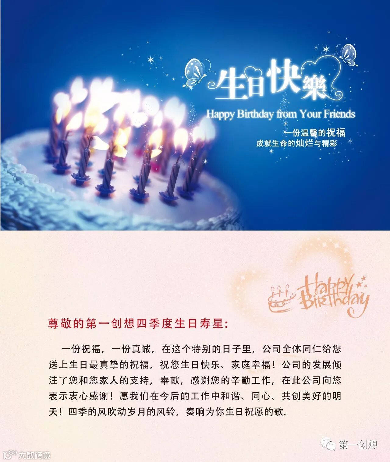 一份祝福,一份真诚,在这个特别的日子里,公司全体同仁给您送上生日最真挚的祝福,祝您生日快乐、家庭幸福!公司的发展倾注了您和您家人的支持,奉献,感谢您的辛勤工作,在此公司向您表示衷心感谢!愿我们在今后的工作中和谐、同心、共创美好的明天!四季的风吹动岁月的风铃,奏响为你生日祝愿的歌。