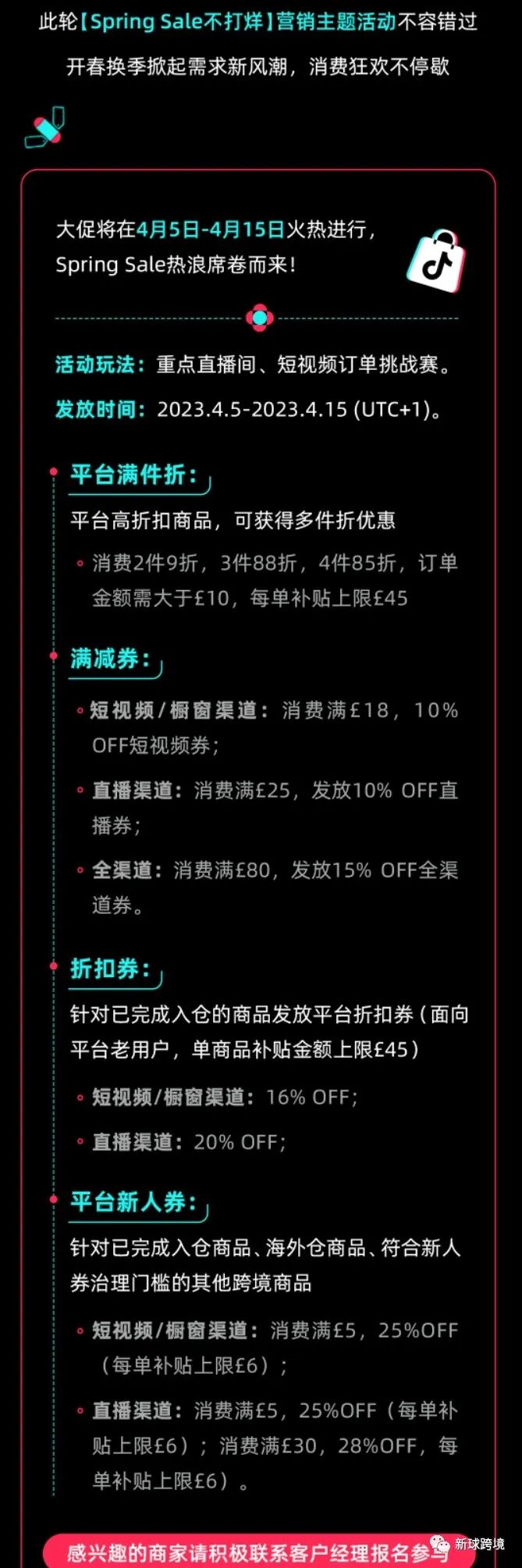此外,TikTok Shop还宣布了下一轮营销主题活动“Spring Sale不打烊”。大促活动时间为4月5日至4月15日。活动玩法: 重点直播间、短视频订单挑战赛。