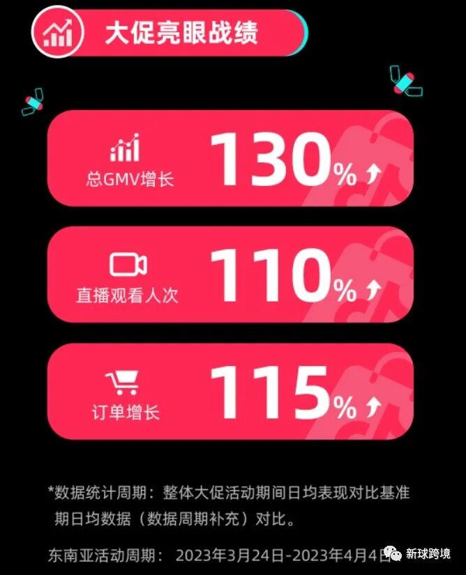 在东南亚市场,TikTok Shop总GMV增长超130%,直播观看人次超110%,订单增长超115%(东南亚活动周期: 2023年3月24日-2023年4月4日)。