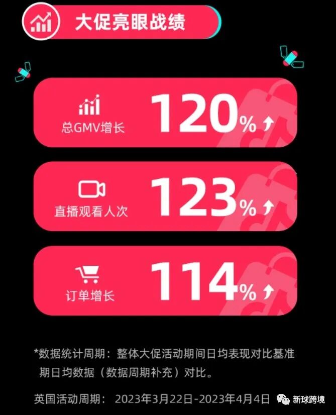 在英国市场,TikTok Shop总GMV增长超120%,直播观看人次超123%,订单增长超114%(英国活动周期:2023年3月22日至2023年4月4日)。