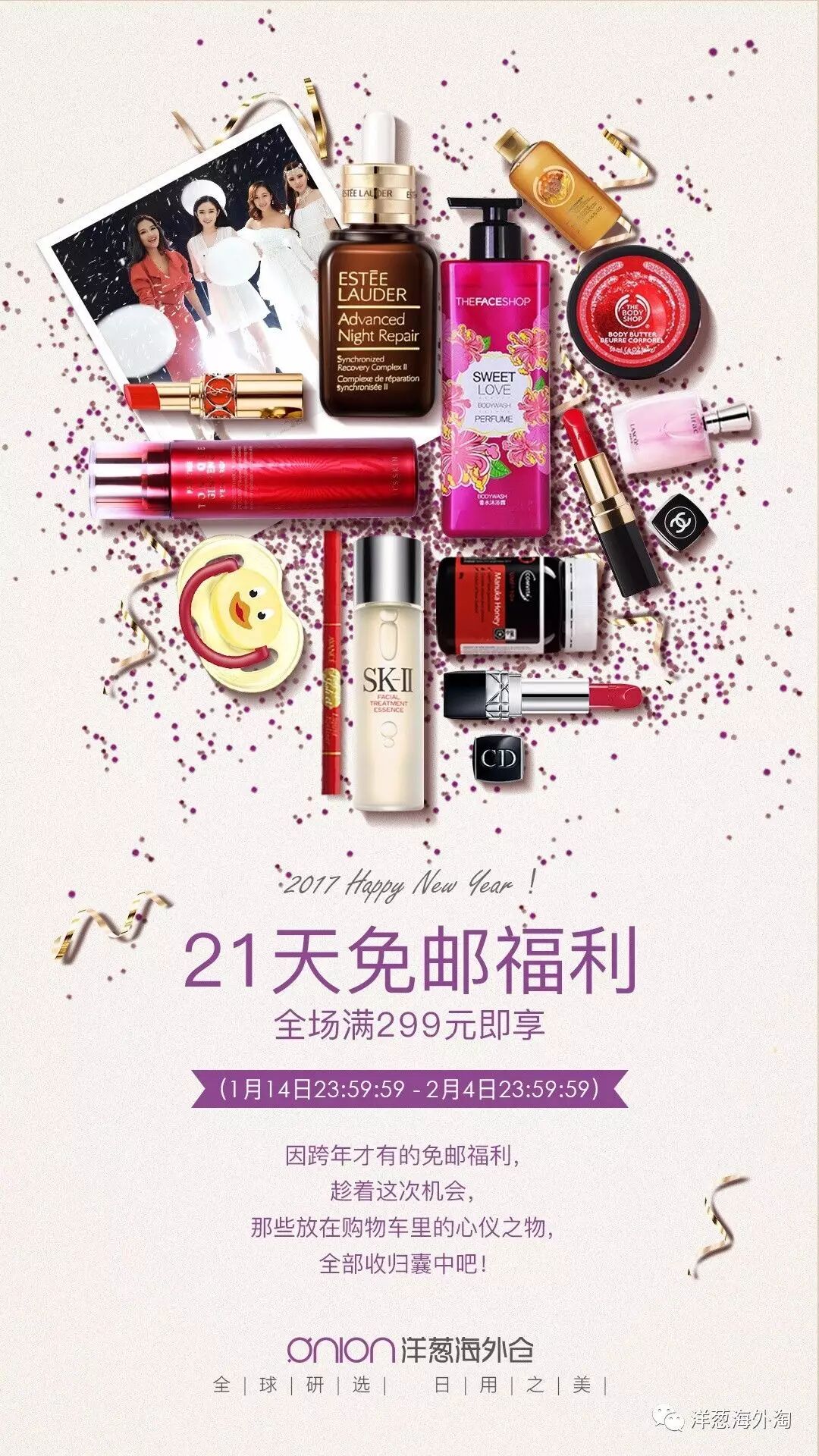 从1月14日23:59:59—2月4日23:59:59期间,全场满299元免邮免邮免邮(包含清关费和运费)。