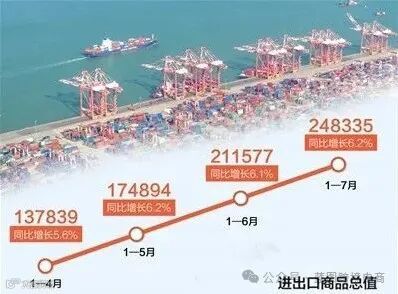 据海关统计,今年前7月,我国货物贸易进出口总值达24.83万亿元,同比增长6.2%。其中,出口14.26万亿元,同比增长6.7%;进口10.57万亿元,同比增长5.4%。