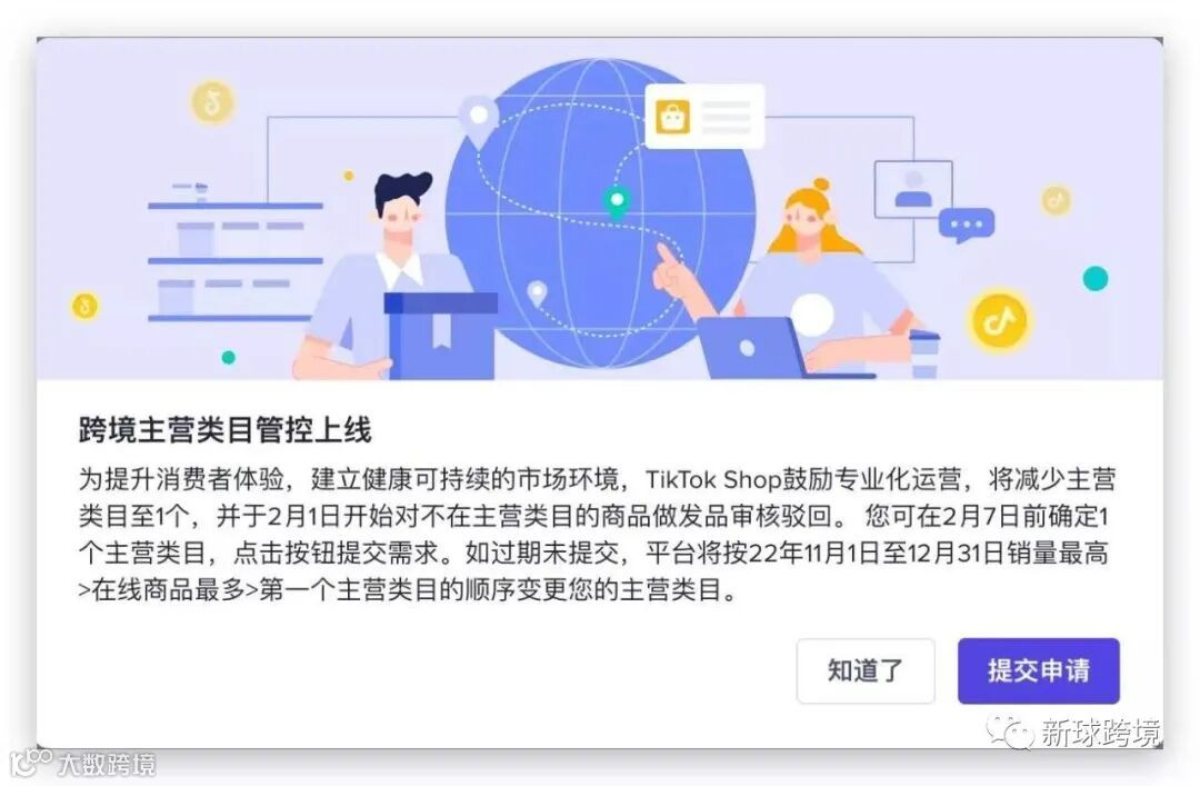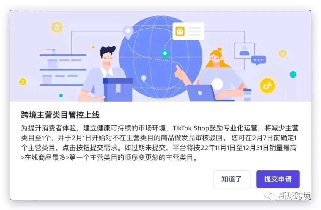 日前,TikTok发布管控政策弹窗提醒。据悉,2月1日起,TikTok跨境小店将对不在主营类目的商品做审核驳回,且平台要求2月7日前商家必须确定一个主营类目,逾期未提交的,平台会根据过往11-12月数据,强制选择一个主营类目。据了解,该操作将直接影响到所有国家站点。