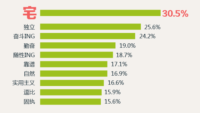 30.5%的90后认为自己很宅,62%的90后最喜欢的休闲娱乐方式为宅在家里上网,位列90后自我评价中前三的还有独立和奋斗。