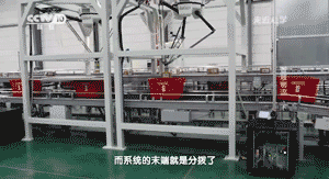 流水线两边很多播种机器人,通过真空吸盘,把周转箱内的商品吸到快递包装箱里。